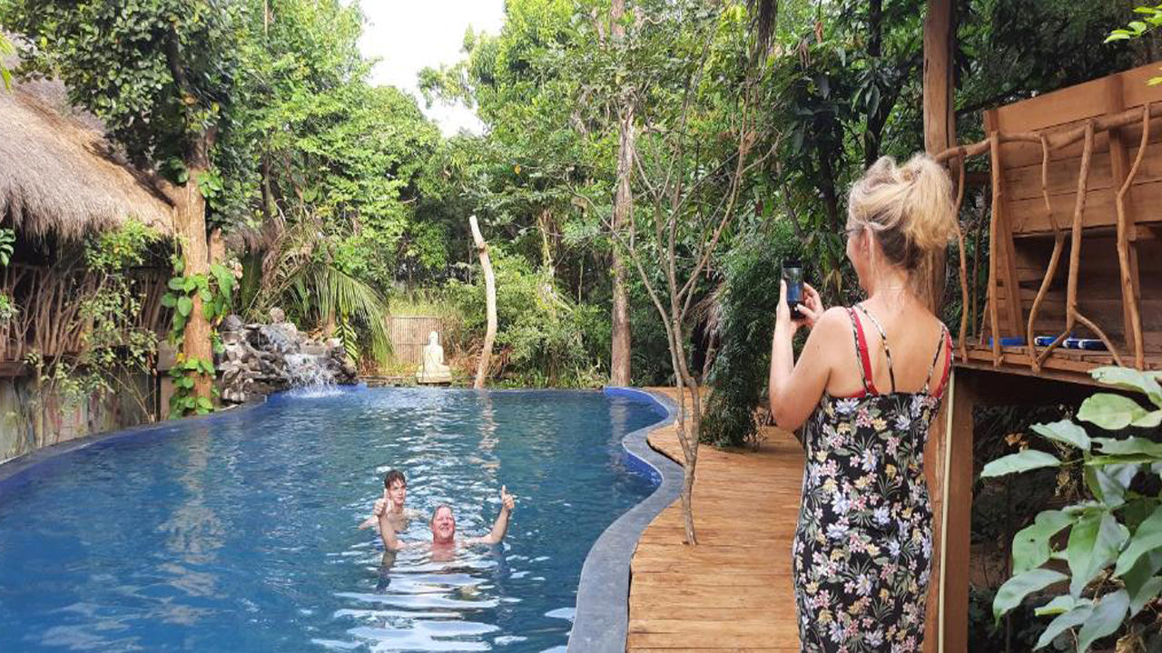 The property features charming wooden treehouses built with traditional craftsmanship and eco-friendly materials. Each unit includes comfortable bedding, private bathrooms, and balconies overlooking tropical greenery and village landscapes.