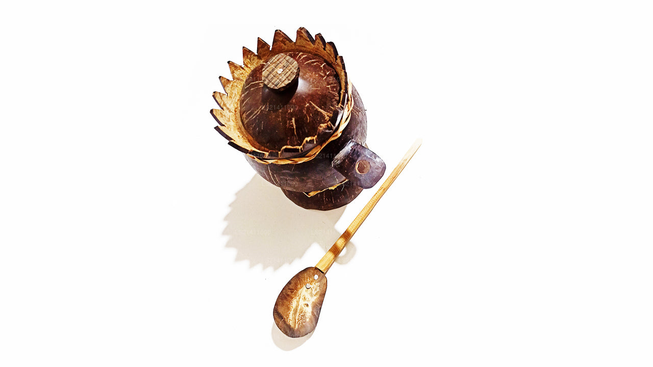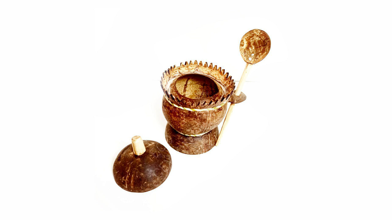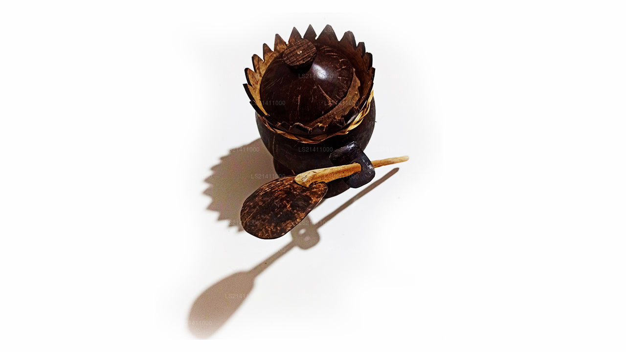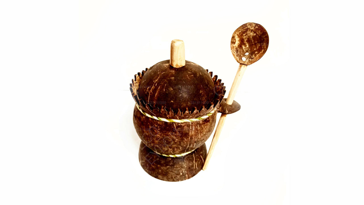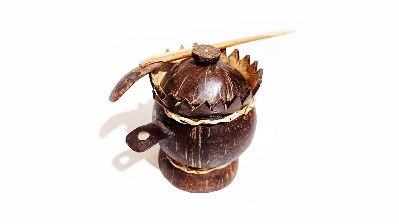 (SKU: LS21411000) Are you still having your salt in a plastic bottler with a plastic spoon? You got to know that’s not the way you do it, when you have a coconut shelf salt container with a unique design and a spoon and attached to it. It also has a cover so that insects or dust can’t get in to it. It will not only be useful but another natural ornament between your collection of spice containers. Please note that this come with no shine